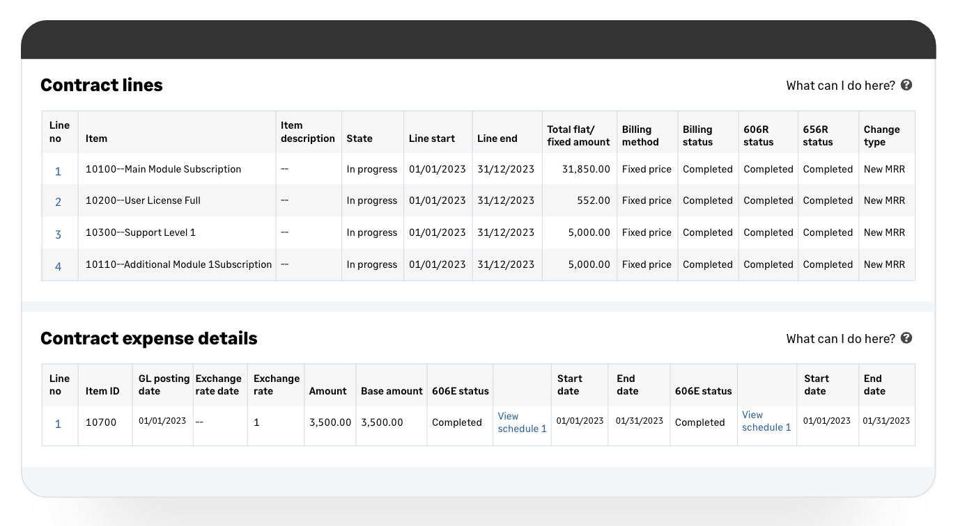 Quickly see order, fulfilment of performance obligations, revenue recognition, billing and collection details